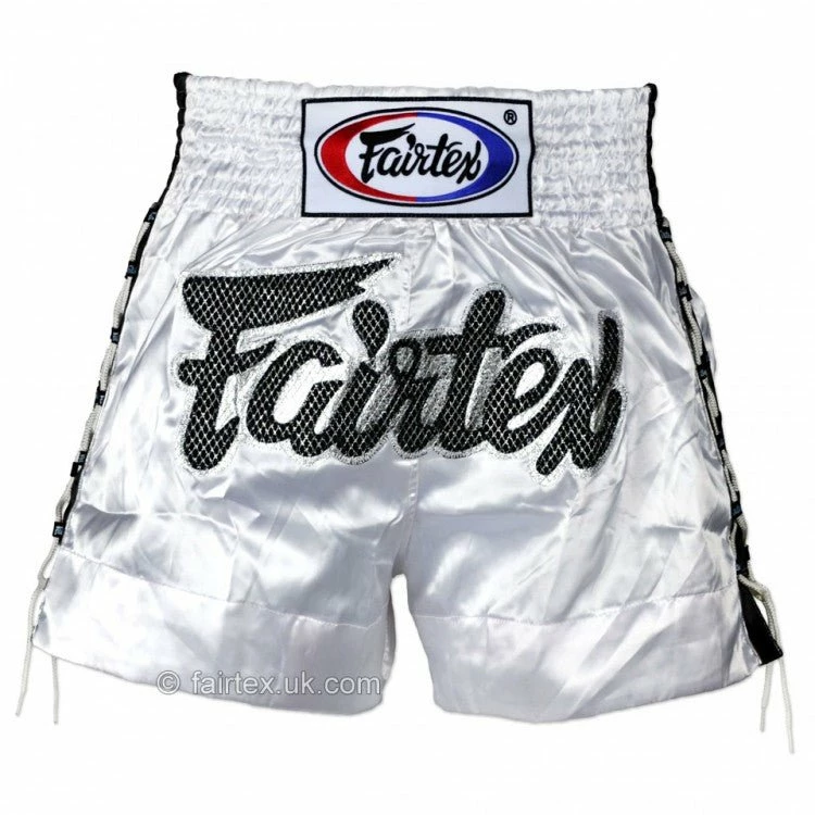 Fairtex BS0604 White Laced Sides Muay Thai Shorts are 100% Satin handmade in Thailand and offer a modern take on the standard designs for Thai boxing. With the famous Fairtex logo across the front of the garment; deep waistband and typically excellent quality