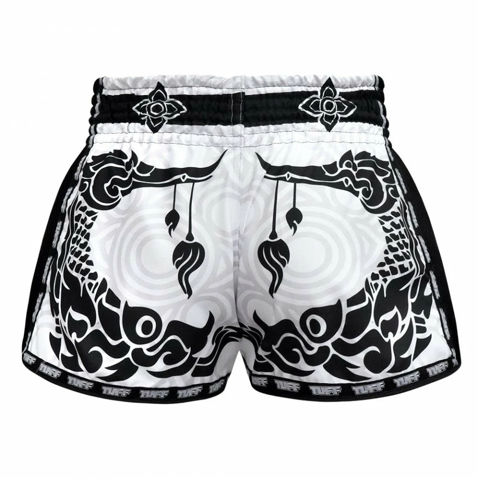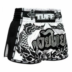 The white boxing shorts feature a black Thai traditional pattern which is influenced by the graceful Hongsa and the guardian of the treasure, Naga.