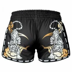 With the contrast of gold and black, the retro-style boxing shorts emphasize the two golden tigers beautifully, making the design stand out even more. The low waistband and short cut with leg slits on both sides openings to maximize the range of motion. The shorts are made with outstanding hand-made quality and sublimation printing technology. Features a hand-stitched embroidered “Muay Thai” PU.