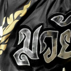 The black boxing shorts feature a golden Thai traditional pattern which is influenced by the graceful Hongsa and the guardian of the treasure, Naga.