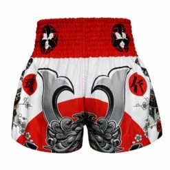 Inspired by the movie title, “Yamada: The Samurai of Ayothaya”, this Muay Thai shorts represents the bonding relationship between Thai and Japanese fight culture. The movie was about a Samurai, Yamada, who was attacked by a squad of disloyal Japanese ninjas. He was rescued and nursed back to health by a group of Siamese warriors, in service to the King of Ayothaya. Yamada stays with the warriors, befriending them, learning their art, and eventually pledging his loyalty and life to the Kingdom of Siam.